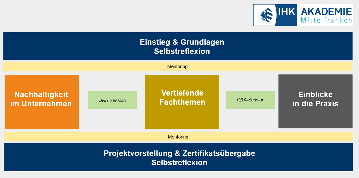 Der Zertifikatslehrgang "CSR-Manager/in (IHK)" vermittelt in kompakter Form wissenschaftliche Grundlagen, praxisorientiertes Managementwissen und anwendungsorientierte Instrumente für ein ganzheitliches Nachhaltigkeitsmanagement im Unternehmen. Das Qualifizierungskonzept wurde in der IHK Nürnberg für Mittelfranken mit einer Expertengruppe und in Zusammenarbeit mit der DIHK-Bildungs-GmbH entwickelt und setzt einen bundesweiten IHK-Zertifikatsstandard.